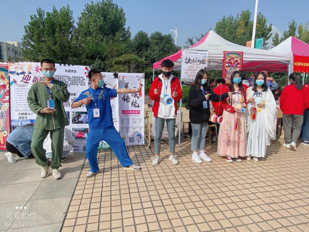 图为10月12日迎新现场,药学系社团学生带来精彩的八段锦、空竹表演等特色表演。