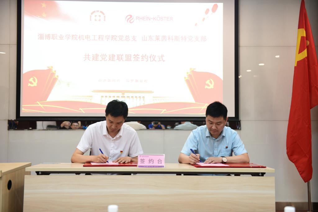 机电工程学院党总支副书记刘晓麟、山东莱茵科斯特党支部副书记陈鹏代表双方签署了《党建联盟协议书》。