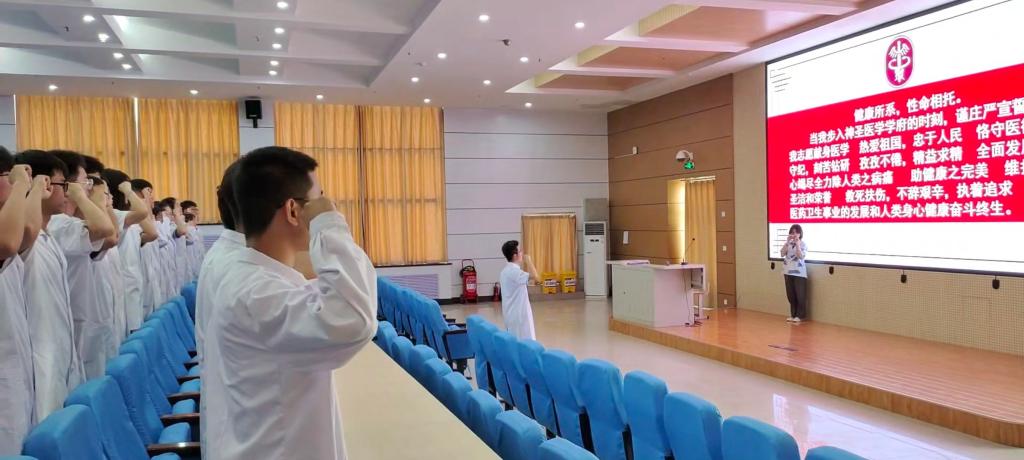 宣誓仪式上,传达学习习近平总书记在庆祝中国共产党成立100周年大会上的重要讲话精神,学生工作负责人与学生回顾百年党史,激发时代青年的爱国心,增强做中国人的志气、骨气、底气,同时提出医学生的职责和医学生实习的意义,增强了医学生的责任与担当。