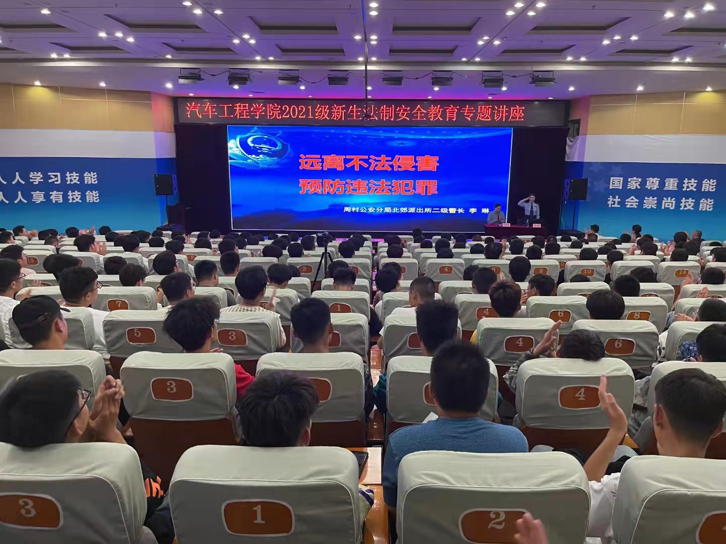 本站讯(通讯员 王国玲)9月28日,汽车工程学院在立德楼报告厅开展2021级新生法制安全教育活动,特邀淄博市公安局周村分局北郊派出所二级警长、淄博职业学院特聘法制教育辅导员李琳作专题讲座。活动由汽车工程学院院长高晓琛主持,该院师生代表400余人参加。