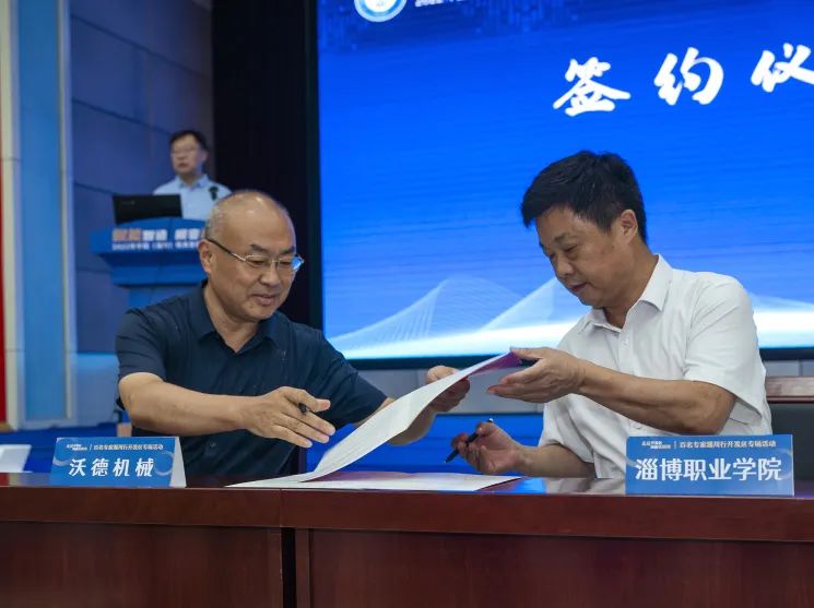 论坛上,智能制造学院院长潘学海与淄博沃德机械科技有限公司董事长张龙宜签订合作协议,双方将在新产品研发与模具设计制造协同、产业链提质降本增效等各个维度展开进一步的交流与合作。