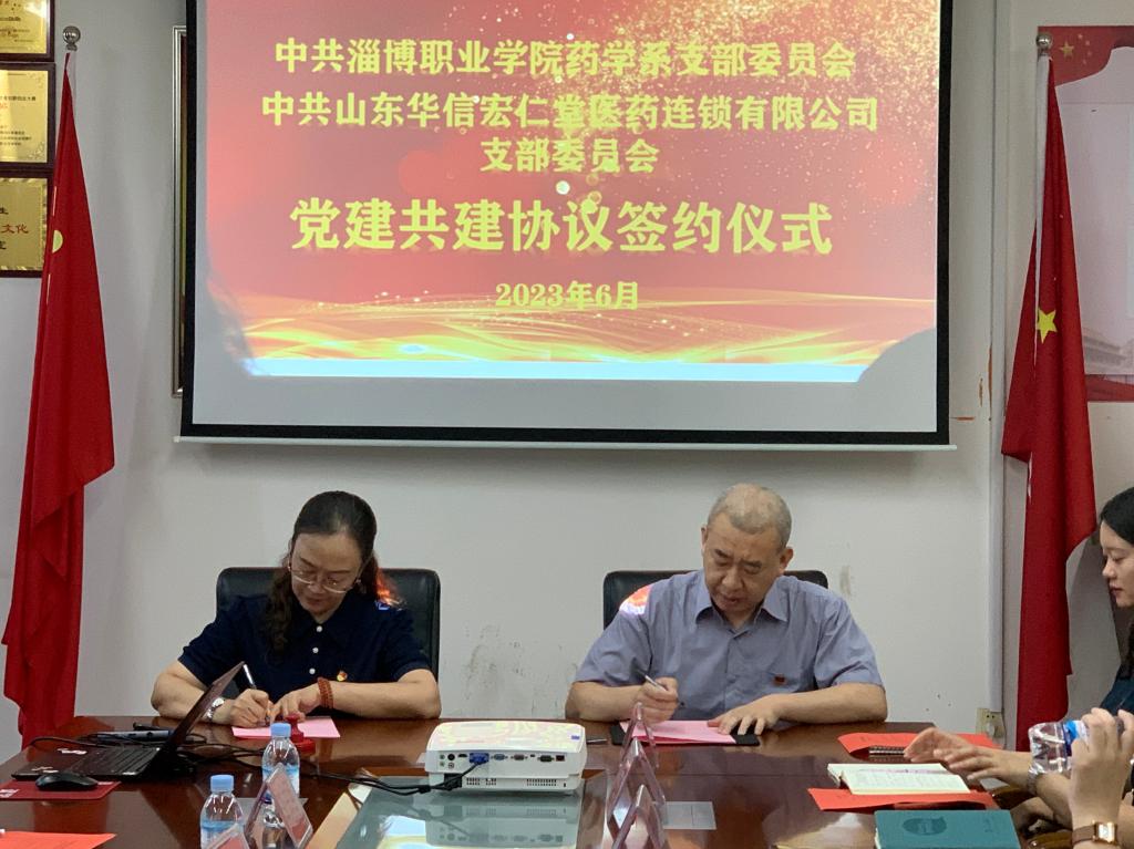本站讯(通讯员 张楠)为深化校企党建与业务工作融合,提升基层党建水平,构建“资源共享、双向服务、互惠共赢”的校企合作新格局,6月14日下午,药学系党支部与山东华信宏仁堂医药连锁有限公司(以下简称宏仁堂)党支部党建共建协议签约仪式在药学系党员会议室举行。宏仁堂党支部书记刘晓燕一行4人,学校党委委员、组织人事处处长朱雯,药学系党支部书记王松及该系党员教师、学生入党积极分子代表参加签约仪式。