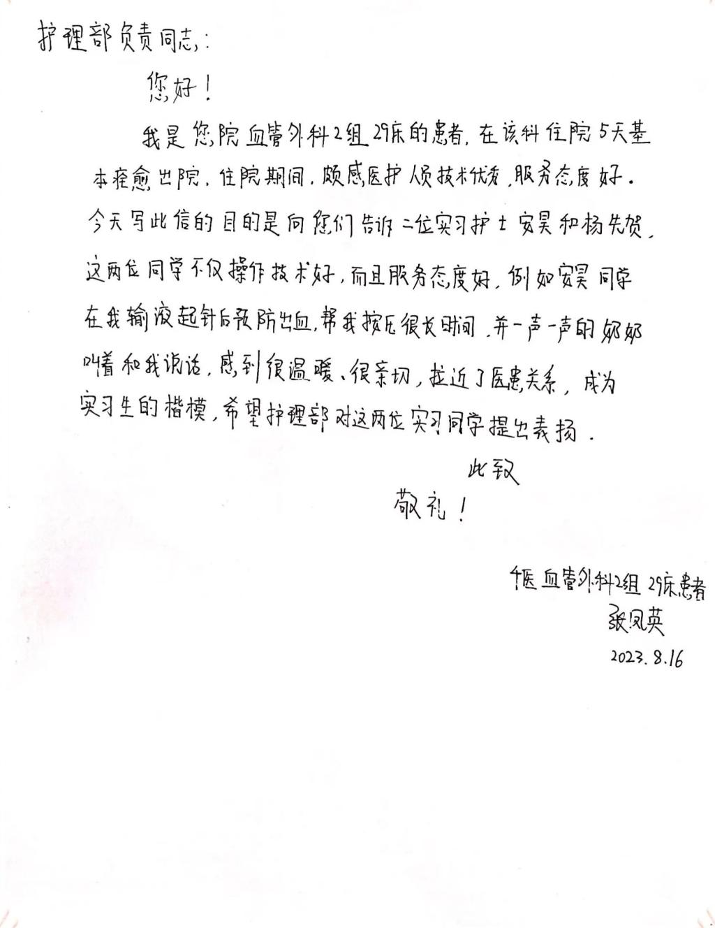 来信表扬杨先贺同学操作技术好、服务态度好,让患者感受到了温暖和关爱,拉近了医患关系,是实习生的楷模。