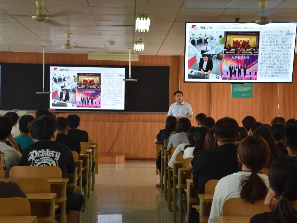 贾立建以《绽放青春之光芒谱写时代新篇章》为题与同学们交流,以学长的身份分享了自己在校期间以及工作以来的经历。自2013年5月入职太平洋电销以来,他虚心好学、踏实肯干,在平凡的岗位上取得了不平凡的成绩:2016年5月荣获淄博市总工会“振兴淄博劳动奖章”荣誉称号,2018年4月荣获山东省省委省政府“山东省劳动模范”荣誉称号,2018年10月荣任中国工会第十七次全国代表大会工会代表。他鼓励大家发扬不怕苦不怕累的精神,练就过硬本领,树立积极就业观念。讲课现场围绕工作的价值和需求层次理论展开互动,引起了同学们地纷纷热议。