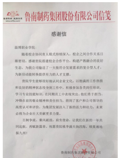 据悉,该企业每年接收学院学生百余人次,校企联合开展跟岗实习、顶岗实习、就业等工作,学生在企业岗位上发挥着吃苦耐劳、勤奋好学、严于律己、团结协作的良好工作作风。企业在信中表示,自建立校企合作关系以来,部分优秀毕业生成为公司的骨干,希望以后能一如既往地开展长效性的深度合作,实现学生、企业和社会多方共赢的局面,也期待更多的毕业后投身鲁南制药,为医养健康事业作出贡献。
