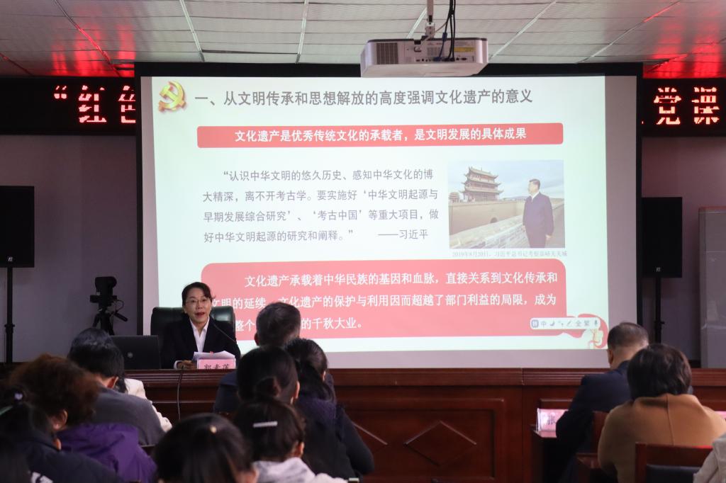 活动中,淄博职业学院马克思主义学院教师郭素莲以“保护历史文化遗产 推动文化传承发展——习近平总书记关于历史文化遗产的思想与实践”为主题,讲授专题党课。她从历史文化遗产的价值和意义,讲述以科学的理念对待历史文化遗产保护的意义,文化遗产对促进文明交流互鉴和国家建设发展的作用,以及从制度和法治建立文化遗产保护长效机制等方面,深入解读了习近平总书记关于历史文化遗产的思想与实践。