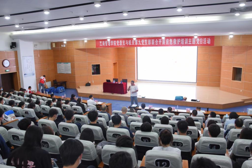 本站讯(通讯员 马宏宇)5月28日下午,工商管理学院党总支与机关第九党支部在南区报告厅联合开展应急救护培训主题党日活动。周村区红十字会党组书记、常务副会长、机关党支部书记段纯强,工商管理学院党总支与机关第九党支部60余名党员教师以及工商管理学院全体入党积极分子参加活动。