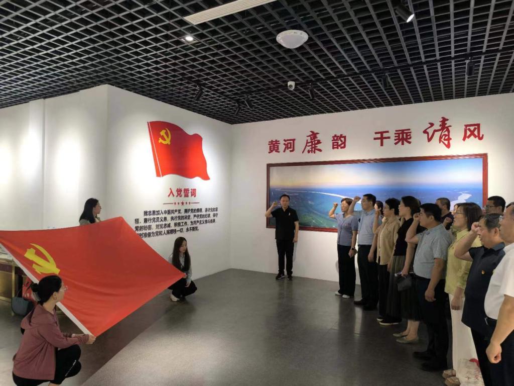第二阶段,双方党员干部一同前往高青县“大河清风-黄河廉洁文化”教育基地参观,接受现场教育。全体党员在基地讲解员的引导下,循着历史文化的轴线,以黄河为纽带,参观了馆中陈列的实物,寻找着廉洁文化在黄河领域留下的印记。通过丰富的历史文物、图片资料和多媒体展示,生动展现了黄河廉洁文化的深厚底蕴和时代价值。党员们认真聆听讲解,不时驻足观看,在厚重的黄河廉洁文化中汲取营养,接受熏陶。最后,大家在纪念馆大厅重温入党誓词,合照留念。