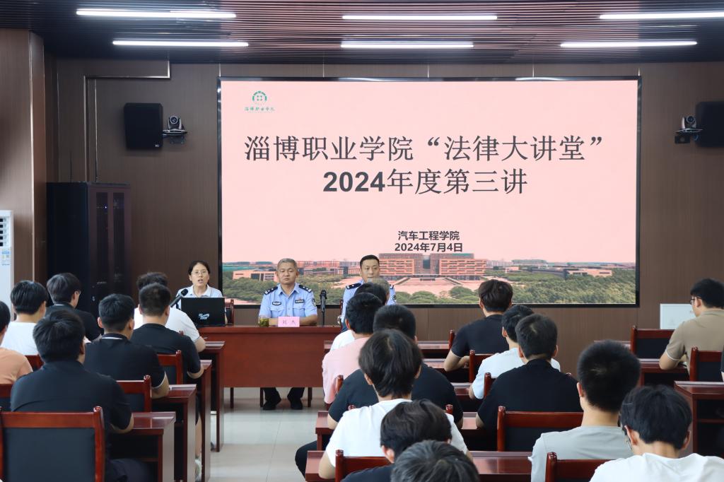 本站讯(通讯员 吕俊杰)7月4日,汽车工程学院在匠技楼D座506室开展“法律大讲堂”2024年度第三讲专题讲座。讲座邀请淄博市公安局刑侦支队二大队副大队长刘杰、淄博市公安局周村分局经侦大队三级警长韩恺主讲,该院全体辅导员、学生代表70余人参加。