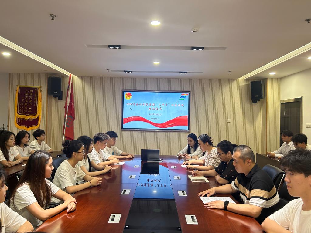 本站讯(通讯员 荣欣慧)7月9日,会计学院2024年暑期“三下乡”社会实践团队出征仪式在南区B210会议室举行,会计学院党总支书记孙红梅、分管学生副院长孟昱及各实践团队代表等60余人参加。