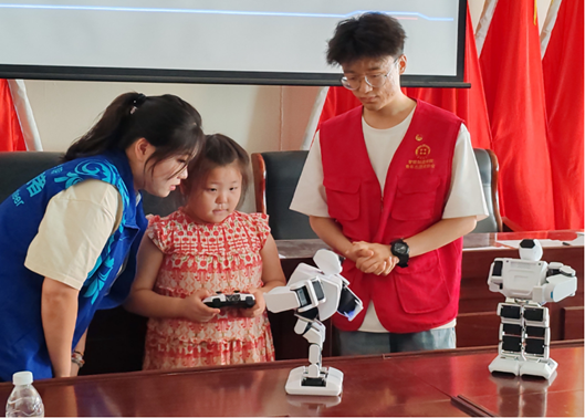 而在“乐聚机器人”课程中,孩子们更是被机器人的智能与灵活所折服。实践队员用心地展示着机器人在现代生活中的应用场景,孩子们的目光紧紧跟随,对机器人世界的浓厚兴趣瞬间被激发。随后,通过深入浅出的编程讲解和遥控机器人表演及互动体验,孩子们不仅掌握了基本的编程知识,还亲手操控机器人完成了各种任务。这种沉浸式的学习方式让孩子们深刻体会到了科技的强大力量与无穷乐趣,也让他们对未来充满了无限的憧憬与期待。