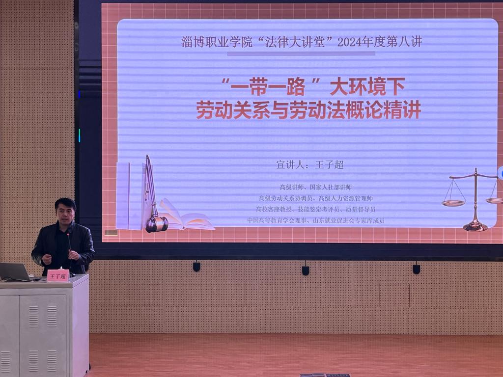 本站讯(通讯员 刘帅)11月22日,文化旅游系在西区报告厅为全体学生举行“一带一路”大环境下劳动关系与劳动法概论”为主题的2024年度“法律大讲堂”第八讲专题讲座。本次讲座特邀淄博市公共就业和人才服务中心王子超主讲,该系党支部书记、分管学生负责人、辅导员及全体在校学生参加。