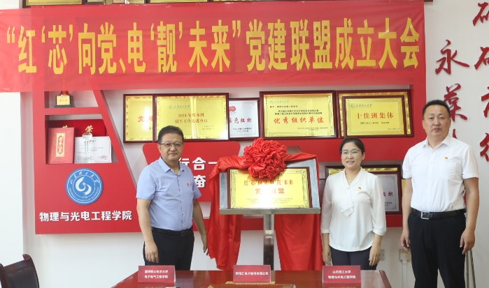 随后,三方共同签署《红‘芯’向党、电‘靓’未来”党建联盟共建协议书》并共同为“党建联盟”揭牌。仪式上,全体党员重温入党誓词。会后,与会人员参观了物光学院光电信息实验室,实地了解学院在科研创新与产学研结合方面的成果。