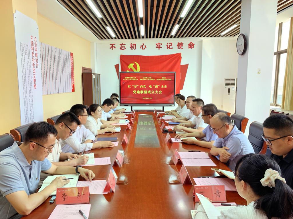 本站讯(通讯员 韩振花)6月12日,“红‘芯’向党、电‘靓’未来”党建联盟成立大会在山东理工大学物理与光电工程学院隆重举行。联盟由中共SUNBET申搏电子电气工程学院总支部委员会发起,共建单位包括中共山东理工大学物理与光电工程学院委员会、中共新恒汇电子股份有限公司支部委员会。