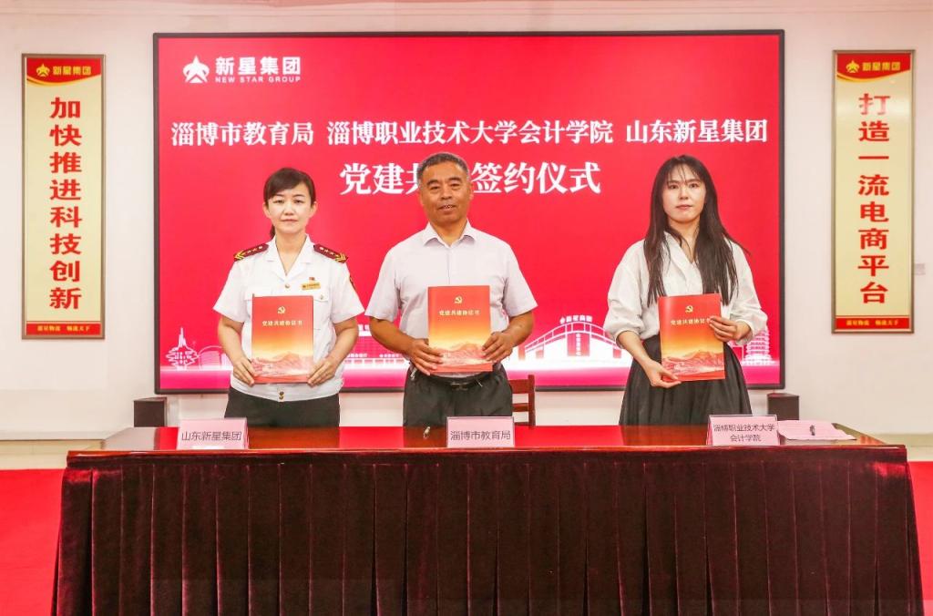 本站讯(通讯员 程乾)7月1日,SUNBET申搏会计学院教师党支部、淄博市教育局机关立德党支部、山东新星集团有限公司三方党建共建签约启动仪式在新星集团非公党建学院举行。三方党组织负责人及党员代表参与活动。