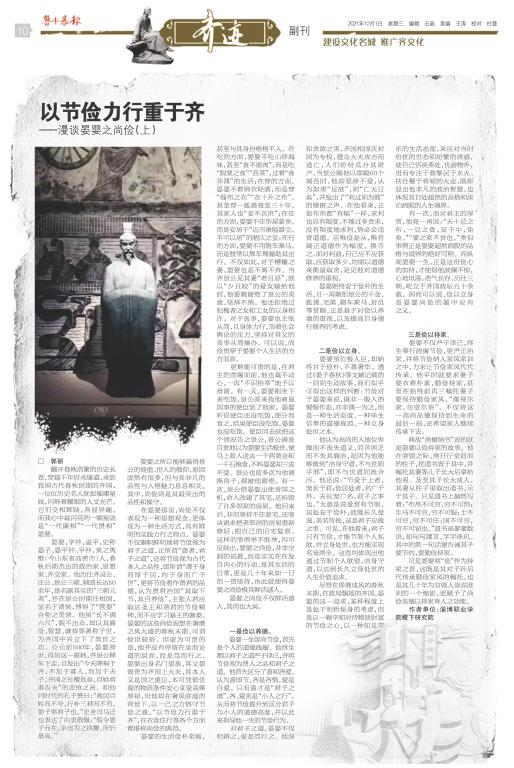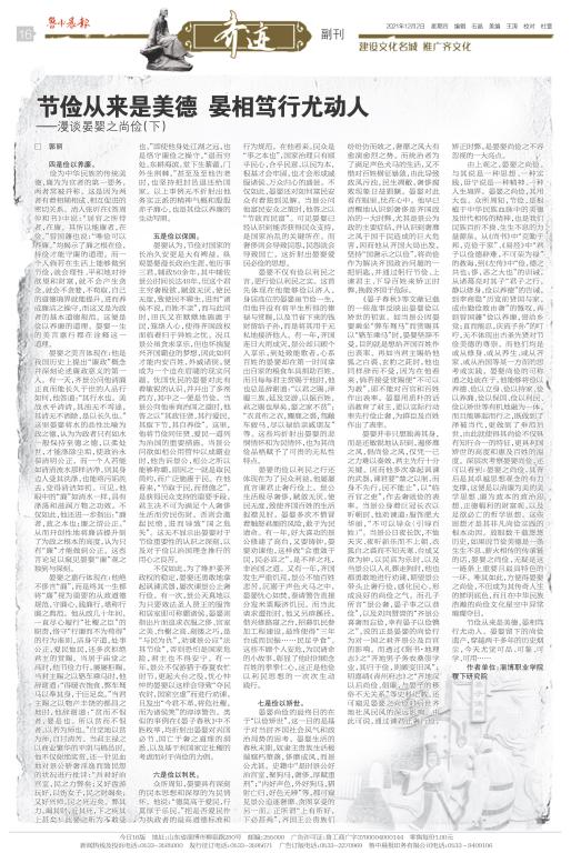 本站讯(通讯员 赵金涛)12月1日、2日,《鲁中晨报》专题栏目“齐迹”连续发表申搏稷下研究院郭丽教授的系列文章《漫谈晏婴之尚俭》。