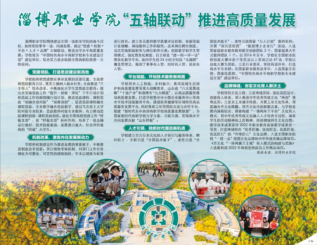淄博职业学院围绕建设全国一流职业学院的奋斗目标,始终坚持事争一流、内涵发展,通过“党建+机制+平台+人才+品牌”五轴联动,推进办学水平高质量发展。学校现为“中国特色高水平高职学校和专业建设计划”建设单位,综合实力逐步站稳全国高职院校第一方阵前列。