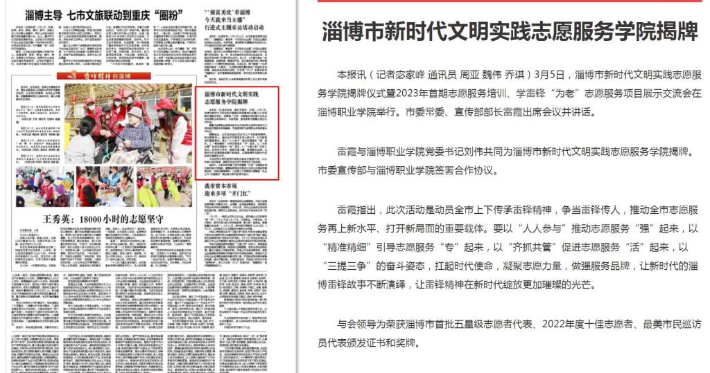 本报讯(记者 宓家峰 通讯员 周亚 魏伟 乔琪)3月5日,淄博市新时代文明实践志愿服务学院揭牌仪式暨2023年首期志愿服务培训、学雷锋“为老”志愿服务项目展示交流会在淄博职业学院举行。市委常委、宣传部部长雷霞出席会议并讲话。