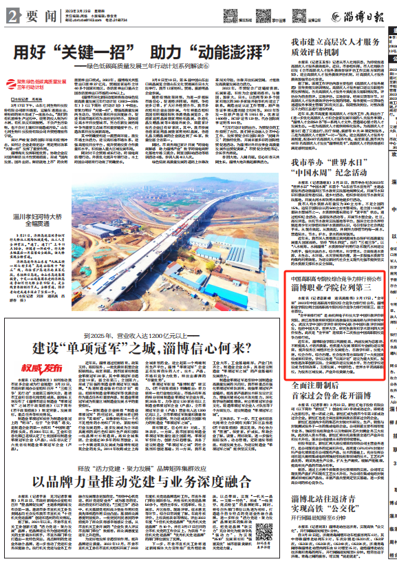 本报讯(记者 宓家峰 通讯员 魏伟)3月17日,“金平果”2023年中国高职高专院校综合竞争力排行榜公布,淄博职业学院位列全国高职高专院校综合竞争力排行榜第三,居全省首位。