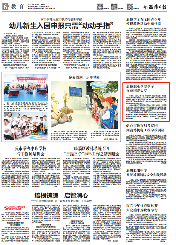 本报讯 近日,第十届“大唐杯”全国大学生新一代信息通信技术大赛信息通信工程实践赛(国赛)在武汉职业技术学院举行。经过5G工程实践赛(仿真)、5G商用设备实践赛的激烈比拼,淄博职业学院人工智能与大数据学院张文健、丁悦两名同学喜获国赛三等奖。