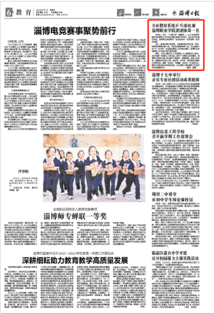 本报讯 近日,“三提三争”看教育——2023年淄博市教育系统教职工乒乓球比赛在淄博中学举行。经过两天的激烈角逐,淄博职业学院荣获“优秀组织奖”和团体第一名的好成绩。