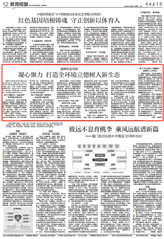 深化“五育”并举。坚持“应用驱动、建以致用”原则,推进混合教学课程改革,推行“岗课赛证”综合育人;优化体教融合育人机制,持续提升“阳光体育”系列活动质量;推进美育课程改革和第二课堂成绩单建设,开展“高雅艺术进校园”活动和美育文化节;强化以课程为中心的劳动教育机制,开展劳动周活动,成立“劳动教育学院”“淄博市中小学职业启蒙和劳动教育(中心)基地”。