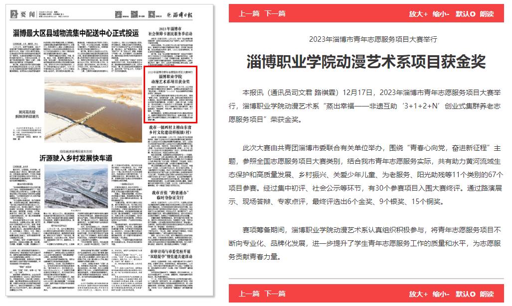 本报讯(通讯员 司文君 路祺霖)12月17日,2023年淄博市青年志愿服务项目大赛举行,淄博职业学院动漫艺术系“蒸出幸福——非遗互助‘3+1+2+N’创业式集群养老志愿服务项目”荣获金奖。