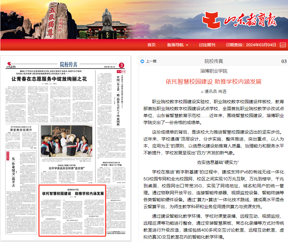 职业院校数字校园建设实验校,职业院校数字校园建设样板校,教育部首批职业院校数字校园建设试点学校,全国首批职业院校教学诊改试点单位,山东省智慧教育示范校……近年来,围绕智慧校园建设,淄博职业学院交出了一份合格的成绩单。