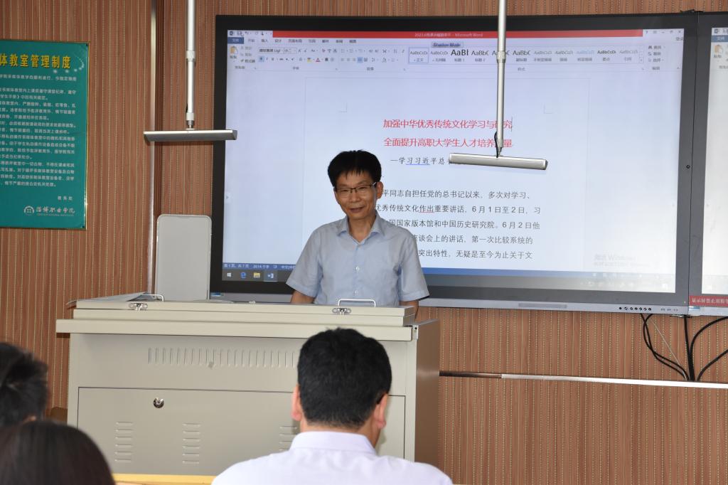 课上,路荣平同志阐述了习近平总书记对中华文化的新论述,讲解了我国优秀传统文化的五个特性,阐释了中华优秀传统文化与马克思主义基本原理的契合性,重申了全面深入了解中华文明的历史对于推进中国特色社会主义文化建设的重要意义。同时,他结合个人工作实际,针对目前高职大学生文化艺术教育通识课程欠缺、人文素质培养亟待提高的问题,提出了优化人才培养方案、加强课程思政建设等一系列解决方案。