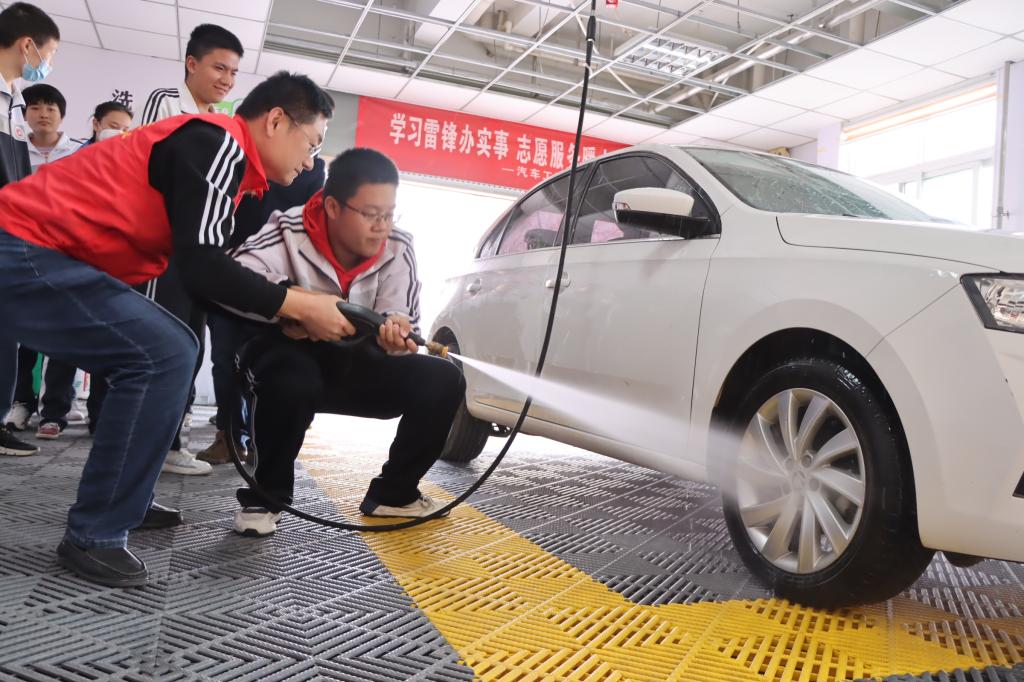 活动中,党员教师对洗车房整装设备进行了检修维护,为孩子们捐赠了一批实用的洗车用具,共同美化了洗车环境。汽车工程学院教师第一党支部书记曾祥军针对高压水枪的维护和保养、汽车美容教学与学生开展一对一的教学指导。