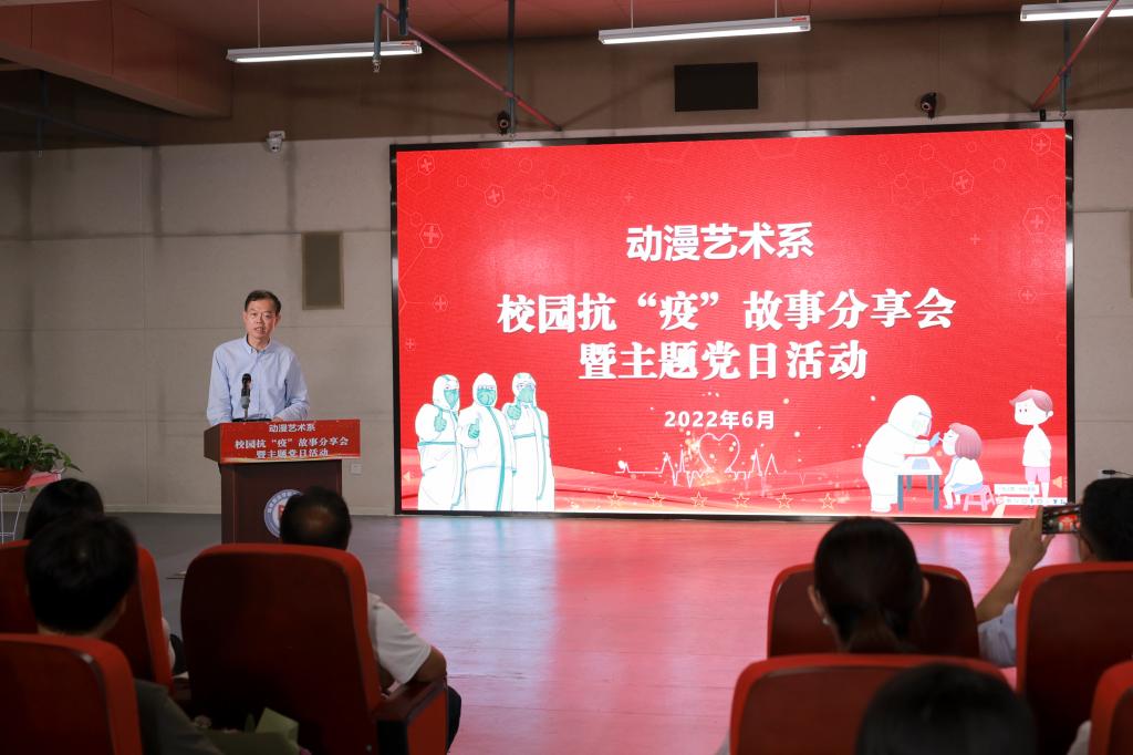 本站讯(通讯员 刘心怡、刘晓宇)为表彰先进,充分发挥榜样示范作用,激励团队凝心聚力拼搏进取,6月14日下午,动漫艺术系在立德楼728室举行校园抗“疫”故事分享会暨主题党日活动。学校党委委员、纪委书记耿玉河,动漫艺术系全体教师及疫情防控学生志愿者代表参加本次活动。