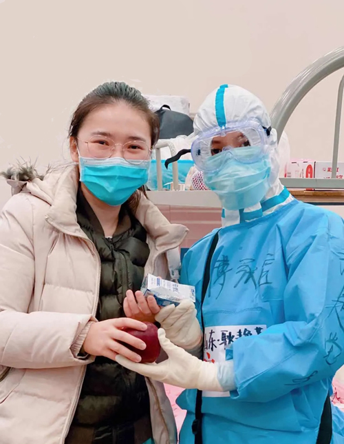 我院毕业生、山东援鄂医疗队队员、张店区中医院的耿艳菲巡视病房时发现有个小姑娘在发呆、不吃饭,跟她聊天后得知当天是她的生日,但父母不在身边,所以感到很失落。于是,耿艳菲与队友们为小姑娘过了一个特别的生日——用牛奶摆出她的年龄,用橙子和苹果摆成心形,并一起为她唱生日快乐歌。小姑娘在感动中许下心愿,愿所有患者早日康复,所有医护人员身体健康,早日打赢这场没有硝烟的战争。