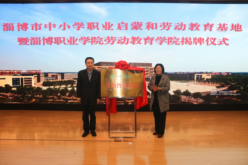 解典和杨百梅为“淄博职业学院劳动教育学院”揭牌。