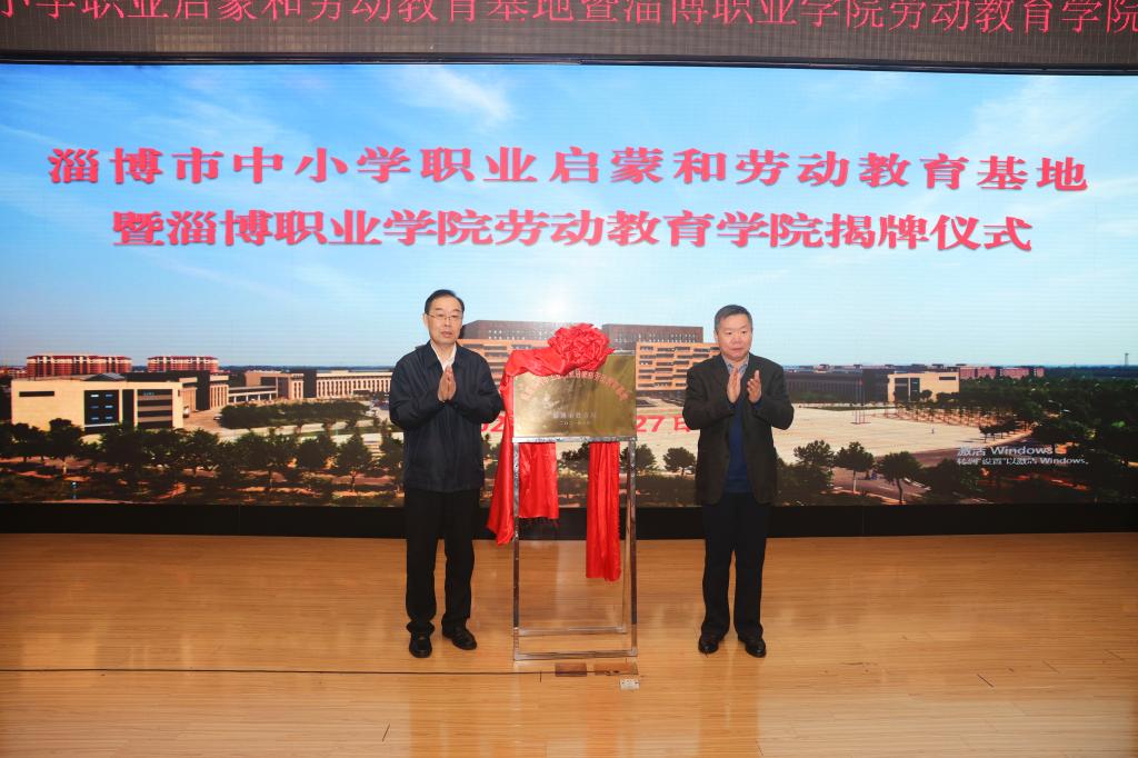 李铮声和张爱民为“淄博市中小学职业启蒙和劳动教育基地”揭牌。