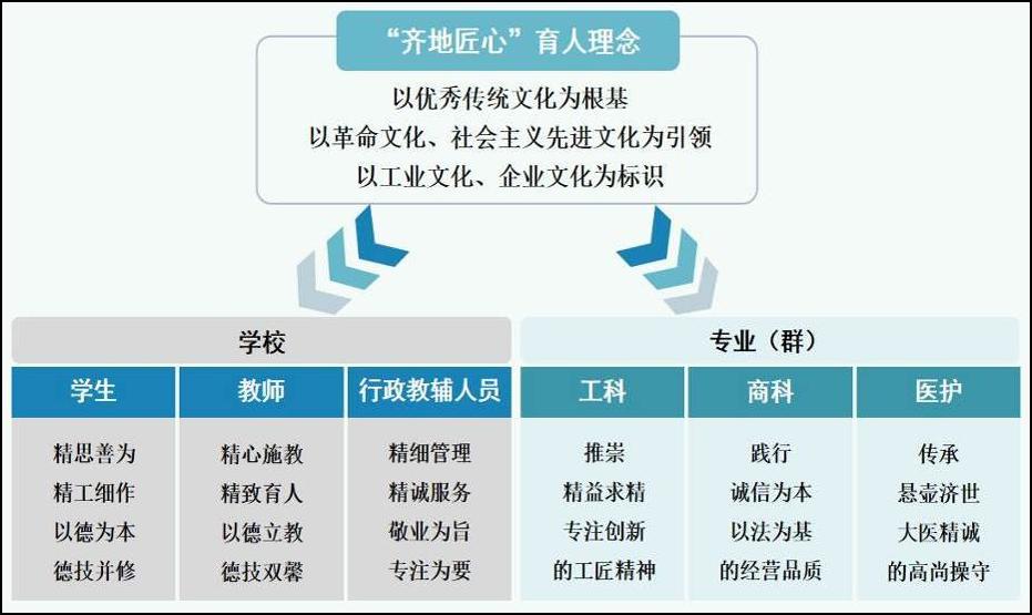 学生追求精思善为、精工细作,以德为本、德技并修;教师崇尚精心施教、精致育人,以德立教、德技双馨;行政教辅人员注重精细管理、精诚服务,敬业为旨、专注为要。对应学校工、商、医三大专业类别,分别树立“工者崇精”“商者重信”“医者仁心”的专业育人理念与价值追求。工科专业推崇“精益求精、专注创新”的工匠精神,商科专业践行“诚信为本、以法为基”的经营品质,医护专业传承“悬壶济世、大医精诚”的高尚操守。“齐地匠心”育人理念在润物无声中促进师生教学相长、实现校园和谐幸福,锻造出一代又一代拥有专注敬业、严谨坚持、敬畏岗位、创新创造等工匠气质的“职业人”。