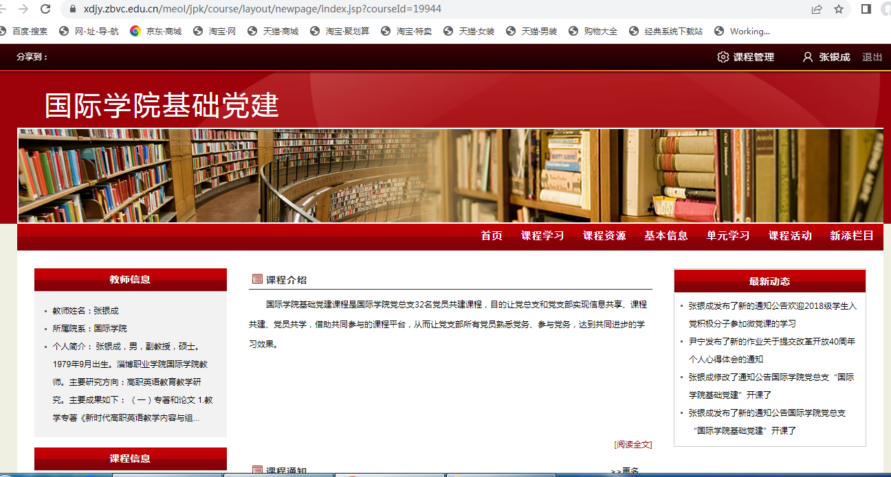 国际学院教师党支部高度重视课程思政建设,成立了国际学院课程思政教学工作室,隶属教师党支部,理顺了教师党支部的工作机制。结合高职院校实际,落实执行教师党支部书记“双带头人”制度,将“党建工作+教育教学+学术科研”职责扎实融合,大胆实践了“党建”与“业务”的有效融合。围绕解决党员教育的“中枢梗”和“课程思政”实施的瓶颈,创新党员教育与“课程思政”推行载体,2018年12月在学院网络教学综合平台搭建了《国际学院基础党建》线上课程(如下图1),并进行了课程化设计,微党课切入。30余名党员率先起步,现已建设微党课114个,先后有我院400余名入党积极分子进入平台学习党建知识,形成了党建和思政教育合力,实现了教师党支部推进课程思政建设的常态化、良性化闭环发展,为支部带来生机与活力。2019年4月,党总支书记朱爱青主持的《新时代中国特色社会主义建设背景下高职院校基层党支部党建工作课程化实践研究》获得校级思想政治重点立项,资助1.8万元。