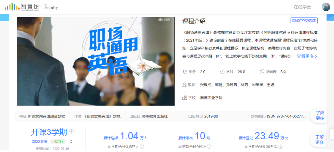 结合语言类课程的特色和《高职英语》课程属性,以《高等学校课程思政建设指导纲要》为“纲”,以《高等职业学校英语课程标准》为“目”,纲举目张,探索建构《高职英语》课程思政教学体系,实现“教学内容与课程思政润融一体”“线上教学与线下教材交融一体”和“课内教学与课外自主汇融一体”,推进《高职英语》课程思政教学改革实施。 2021年《高职英语》被学校遴选为校级在线精品课程和课程思政示范课程重点培育课程,率先做到线上“建-试-用”与线下教“教-编-改”同步,课程思政建设采用了“一书一课一库二平台”建设模式也属于首创。现在智慧树上线的《职场通用英语》在线课程成为《高等职业学校英语课程标准》(2021年4月)颁布后的首个配套的在线课程(如下图3)。开设3期选课人数达到1.04万,累计师生互动23.49万人。