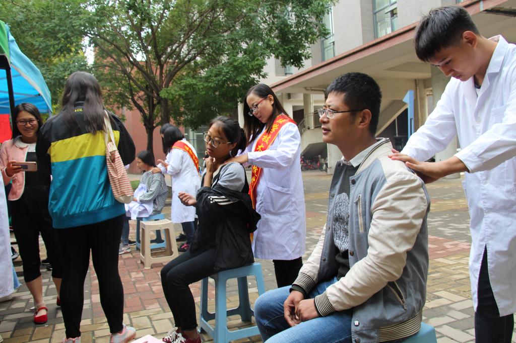 10月11日下午,为进一步弘扬志愿服务精神,引导广大青年以实际行动向党的十九大献礼,由医学技术学院“中医理疗”社团和志愿者协会联合举办的“喜迎十九大·志愿服务你我他”暨“庆国庆·义诊行”志愿服务活动在北校区餐厅门口举行。